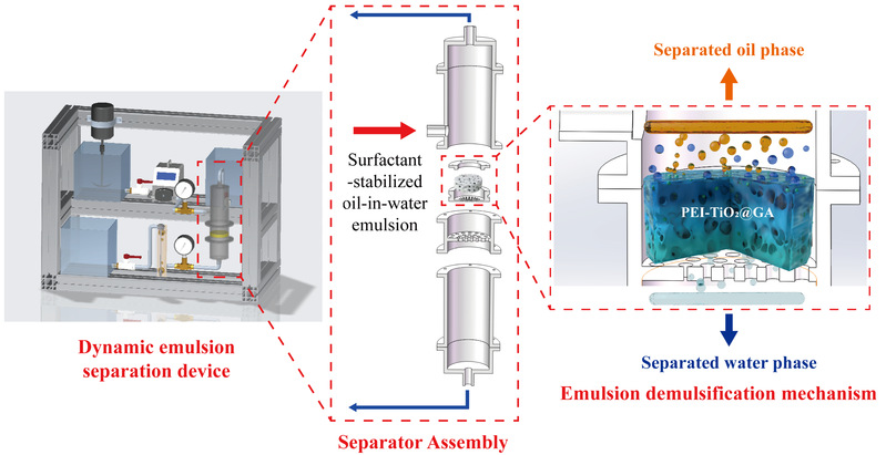 基于天然生物质明胶大分子自组装、二氧化钛颗粒预包埋和聚乙烯亚胺表面修饰技术,研究团队开发了两亲超润湿性仿生材料——PEI-TiO2@GA气凝胶。PEI-TiO2@GA不仅具有大容量油相吸收和染料吸附特性,还具有较高的机械强度。借助简单的预润湿过程,便可实现材料界面在超亲油性和超疏油性之间的选择性切换,并可重复使用。结合全新开发的连续分离装置,可一步实现乳化液高效破乳、微油滴聚结分离和共存污染物靶向去除。此外,研究发现PEI-TiO2@GA界面润湿性能的转变是一个可逆的多步过程,乳化液的破乳分离和共存污染物的吸附去除是两个独立的过程。本研究为用于复杂体系工业废水深度处理的高性能工程材料设计和开发提供了新颖的解决方案。