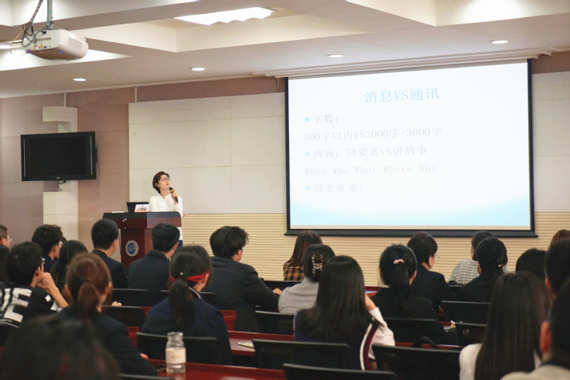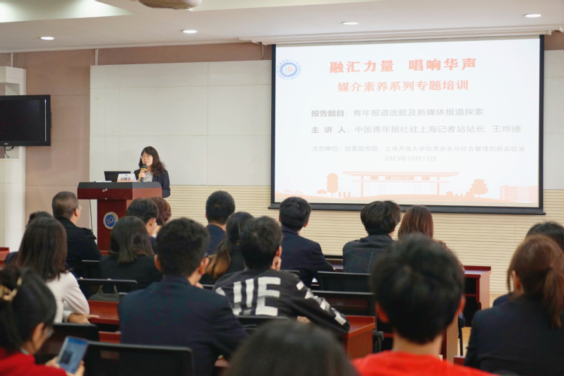10月17日下午,由党委宣传部、上海开放大学信息安全与社会管理创新实验室主办的媒介素养系列专题培训在奉贤校区大学生活动中心419室开讲,中国青年报社驻上海记者站站长、主任记者王烨捷以“新闻写作与新媒体作品呈现”为题,为近80名学生记者和新媒体指导老师作专题培训。培训会由党委宣传部副部长房树芬主持。