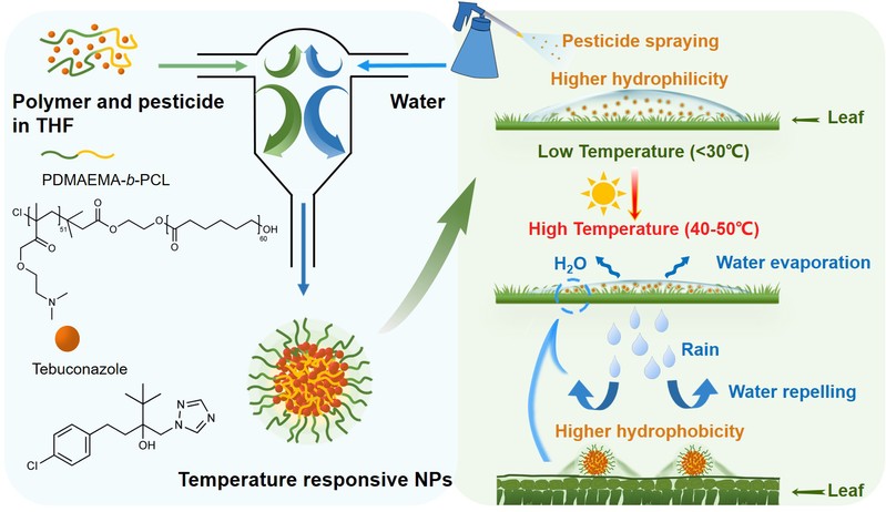 研究团队以温度响应共聚物聚-(2-(二甲基氨基)乙基甲基丙烯酸酯)-b-聚(ε-己内酯)(PDMAEMA-b-PCL)为载体,通过瞬时纳米沉淀技术高效制备了具有温度响应、高叶片粘附以及高载药率的纳米农药制剂,具有良好的稳定性。与市售制剂相比,聚合物的包裹改善了戊唑醇的沉积效果,与叶面接触角降低了40°。由于纳米粒子的小尺寸效应和范德华相互作用,其抗雨水冲刷效果比市售制剂提高了37%。与商业制剂相比,戊唑醇纳米粒子对斑马鱼的急性毒性降低了25倍以上,这表明此纳米制剂具有良好的生物相容性。这项工作有望增强农药液滴的沉积和附着力,最大限度地提高农药的利用率,解决农药应用难题之一。