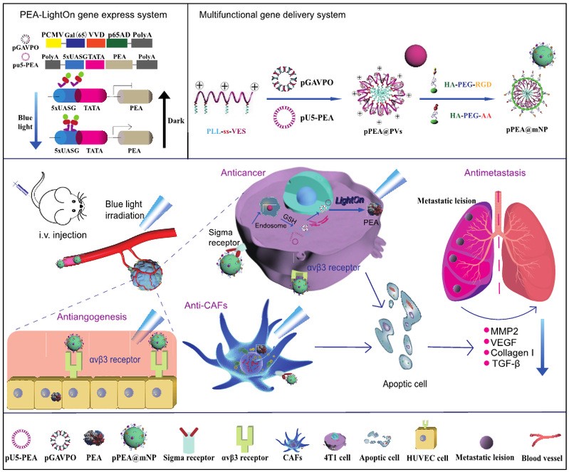 多靶向功能性纳米载体,可将LightOn光控基因系统质粒精准靶向递送至肿瘤细胞、肿瘤相关成纤维细胞和肿瘤新生血管细胞;在蓝光照射的控制下,该纳米递药系统能够时空可控地表达铜绿假单胞菌外毒素A,起到抑制肿瘤细胞、肿瘤相关成纤维细胞和抗肿瘤新生血管生成的作用;进而下调肿瘤部位相关细胞因子水平,改变肿瘤微环境,最终在精准治疗肿瘤的同时,突破乳腺癌转移难题。多靶向多功能纳米载体的靶向性、肿瘤环境响应性释药能力和LightOn系统的时空可控性,赋予了该治疗策略提高疗效和减少毒副作用。