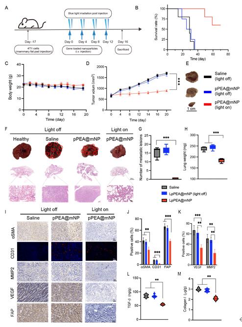 (A)给药方案示意图,Balb/c小鼠于第-17天注射4T1细胞,每4天注射一次pPEA@mNP(含10μg pU5-PEA和10μg pGAVPO),每次给药后进行蓝光照射(90 mW/m2)。(B)荷瘤小鼠治疗后的存活率和(C)体重(n=5)。(D)治疗后的肿瘤大小(n=5)。(E)肿瘤组织的代表性图像(n=5)。(F)治疗后从荷瘤小鼠身上切除的肺组织的代表性图像和H&E染色图像(红色圆圈代表肺转移瘤,比例尺2000 μm,比例尺100 μm)。(H)不同治疗组的肺重量(n=5)。(G)肺转移性结节的数量(n=5)。(I)肿瘤组织的αSMA、CD31、MMP2、VEGF和FAP免疫组化染色(比例尺50 μm,n=3)。(J,K)通过Image J进行免疫定量染色结果(n=3)。(L,M)肿瘤组织中TGF-β和I型胶原浓度的ELISA结果(n=3)。(**P<0.01和***P <0.001)