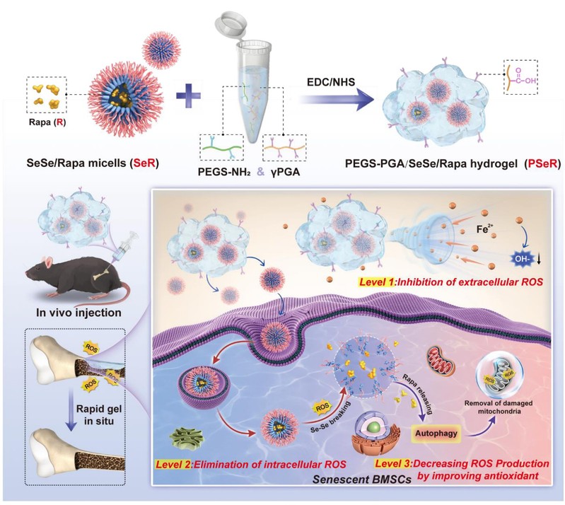 随着全球人口老龄化的加剧,由骨稳态失衡和再生能力衰退引起的老年性骨损伤已成为公共卫生保健领域面临的重大医学挑战。改善衰老的微环境和衰老的干细胞,从而恢复衰老骨再生的干预措施是治疗老年性骨缺陷的一种潜在治疗方法。近日,华东理工大学刘昌胜院士、袁媛教授和张琰教授课题组报道了一种负载含雷帕霉素的聚二硒化物胶束的可注射聚乙二醇化甘油癸二酸酯/聚谷氨酸水凝胶(PEGS-PGA/SeSe/Rapa,PSeR),可用于多维度调控老龄骨再生微环境的活性氧(ROS)水平,恢复老龄骨组织的再生潜能。这一研究成果以“通过多层级活性氧调控材料修复老龄骨”为题发表在《先进材料》上。