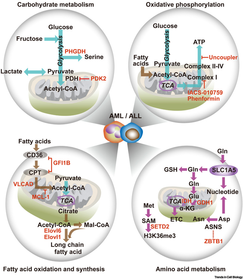 白血病细胞显示出能量和物质代谢的异质性。一般来说,氧化磷酸化对能量产生至关重要,在许多情况下是通过丙酮酸、脂肪酸、谷氨酰胺和支链氨基酸提供燃料。在急性髓系和淋巴细胞白血病中,抑制线粒体呼吸可解除对化疗药物如阿糖胞苷的抵抗,其中,丙酮酸脱氢酶等是潜在的治疗靶标。除了氧化磷酸化,高的糖酵解活性也支持白血病发生发展。对于脂肪酸代谢,无论分解还是合成途径都会驱动白血病的发生。此外,氨基酸和异柠檬酸代谢异常通过改变核苷酸与脂肪酸合成、表观遗传修饰等机制起到了促进白血病发生的作用。这些代谢途径具有密切的联系,在白血病中,抑制葡萄糖氧化通常会代偿性地增加脂肪酸氧化,反之亦然。在葡萄糖/丙酮酸和脂肪酸之间选择底物不仅决定了能量生产的效率,而且还决定了活性氧的水平。