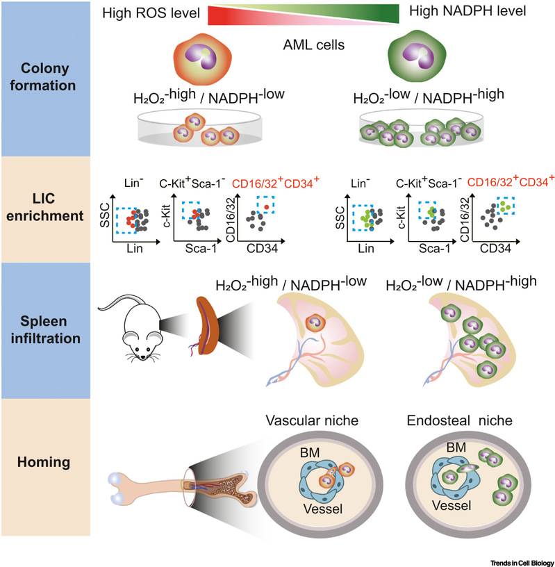 低水平的活性氧对于白血病起始细胞存活和维持静息状态至关重要。利用自主研发的过氧化氢探针HyPerion和NADPH探针iNap,研究团队证明了低的H2O2水平和高的NADPH水平细胞亚群富含更多功能性的急性髓系白血病起始细胞,这些细胞倾向于定位在骨内膜微环境里,移植后白血病发病更快,总生存时间更短。苹果酸酶以及亚甲基四氢叶酸脱氢酶对于这群细胞的白血病形成能力至关重要。除了急性髓系白血病,低的活性氧和高的还原力也与急性或慢性淋巴细胞白血病的发生发展密切相关。