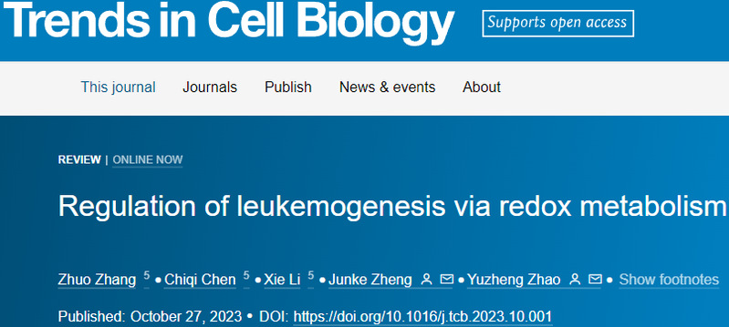 10月27日,华东理工大学药学院、生物反应器工程国家重点实验室、上海市细胞代谢光遗传学技术前沿科学研究基地赵玉政教授与上海交通大学医学院郑俊克研究员,应邀在国际权威学术期刊《细胞生物学趋势》上发表了题为“氧化还原代谢调控白血病发生”的综述文章,对氧化还原代谢调控白血病发生发展的病理机制以及目前存在的关键问题进行了全面梳理、总结和展望。