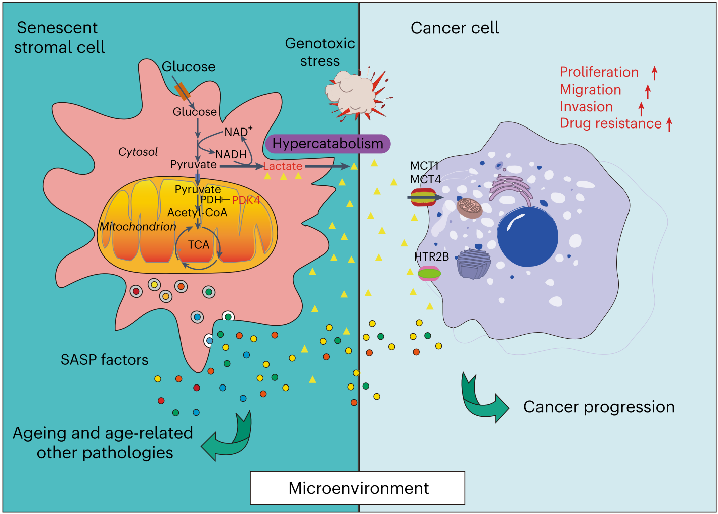 从分子和细胞层面揭示衰老发生的机制,找到延缓衰老的治疗靶点,是生物医学研究不懈追求的重要目标之一。本研究在分析衰老细胞的表达特征和代谢活性时,意外发现了代谢调节酶PDK4在细胞衰老过程中显著上调。更加重要的是,临床化疗后期,癌症患者病灶组织中PDK4的表达水平同微环境层面的细胞衰老直接正相关,并同化疗后阶段癌症患者的生存期呈显著负相关,这意味着PDK4具有十分重要的病理意义。