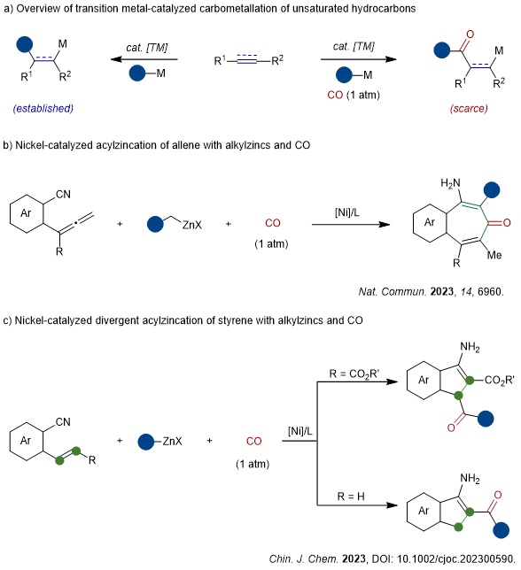近期,课题组进一步分别发展联烯和苯乙烯衍生物参与的多样性酰基金属化串联反应。联烯含有两个连续共轭的π键,反应位点和竞争反应较多,联烯碳金属化反应的化学、区域及立体选择性的多重调控颇具挑战。该团队以邻氰基取代的苯基联烯作为底物,利用有机锌试剂与常压CO在镍催化剂的作用下原位生成亲核性酰基金属物种的策略,实现了联烯的高选择性酰基锌化/环化串联反应,构建了一系列多取代的环庚三烯酮产物。随后,该团队又实现了苯乙烯类衍生物参与的区域发散性酰基金属化串联反应,实现了高度官能团化茚类衍生物的多样性合成。在这些工作中,氰基作为亲电试剂的同时,对反应的区域及立体选择性的调控起到至关重要的作用。