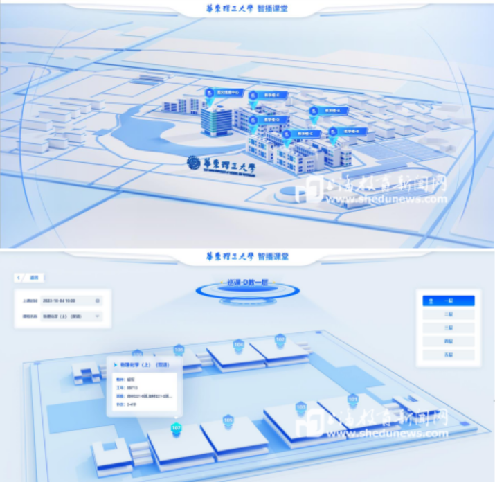 不仅如此,学校还创建了智播课堂可视化云图,支持校内督导、校外专家在线巡课,校外专家可以通过地图模式查看具体教学楼, “一键直达”教室,在线查看课堂授课情况。