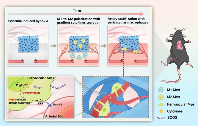 近日,华东理工大学刘昌胜院士和王靖教授课题组在原位组织再生过程高效诱导功能性血管的研究中取得了新进展,发现类肝素磺化壳寡糖(SCOS)调控宿主巨噬细胞诱导动脉血管新生的新规律,实现了在下肢缺血及心梗等急性缺血性疾病中动脉血管的快速诱导长入及有效治疗。这一研究成果以“磺化寡糖激活内皮Notch信号诱导巨噬细胞相关的动脉新生以治疗缺血性疾病”为题,发表在《美国国家科学院院刊》上。
