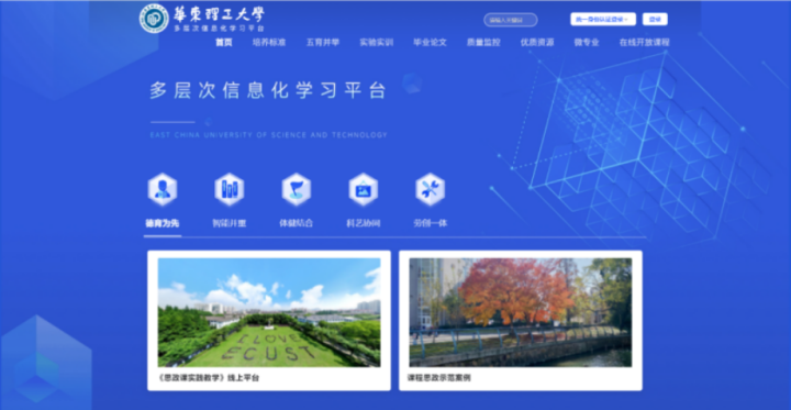 据华东理工大学副校长王慧锋介绍,学校全力推进教育教学的数字化转型,建设了融合式网络学习空间“多层次信息化学习平台”,平台提供了“一网通学”的线上线下融合学习服务。基于平台,开展了面向“五育并举”的教学应用,开发了思政案例、美育大讲堂、园艺与生活等“德智体美劳”课程,提供了线上“双一流”课程、虚拟实验等优质资源。