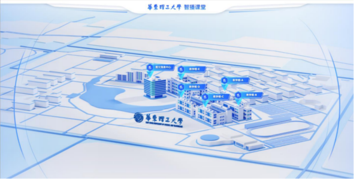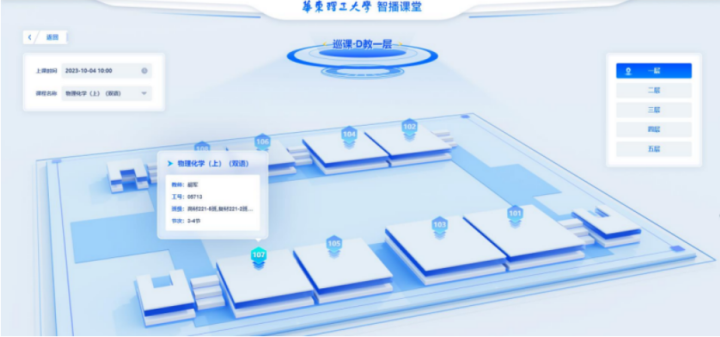 不仅如此,学校还创建了智播课堂可视化云图,支持校内督导、校外专家在线巡课,校外专家可以通过地图模式查看具体教学楼、“一键直达”教室,在线查看课堂授课情况。