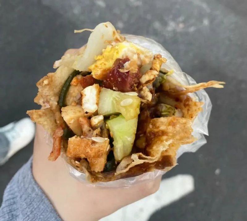 黑街最知名莫过于华理学子们的“梦中情饼”——回锅饼,不同于招牌上花花绿绿、吆喝声此起彼伏的摊位,回锅饼只是一个在犄角旮旯里的昏暗小铺面。但酒香不怕巷子深,每天排队半小时起步。“回锅”,即过油。本就新鲜的食材沐浴油香后被卷进筋道的薄饼中,点一个顶配塞得满满的饼也只是二十块出头。