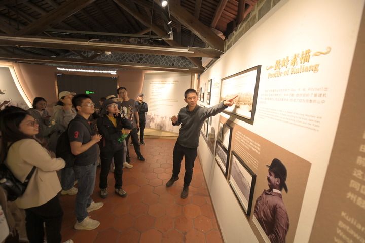 11月23日,林轶南(右一)在修复后的福州鼓岭万国公益社向游客介绍鼓岭故事。