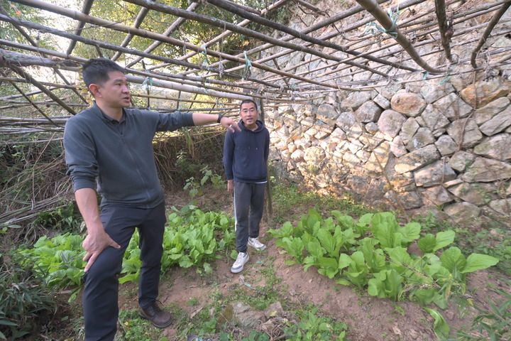 11月23日,林轶南(左)在福州鼓岭与村民郭庆查看外国人修建的别墅旧址。