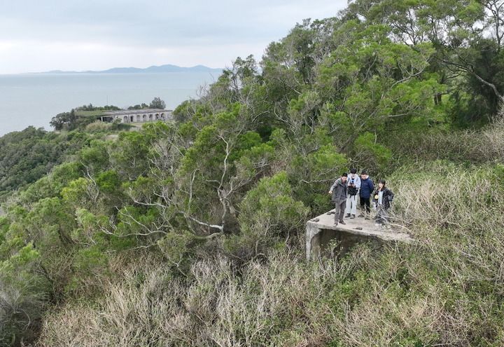 11月25日,林轶南(左一)和“鼓岭家·谱”研究团队在连江川石岛寻找外国人在岛上建造的建筑遗址位置(无人机照片)。