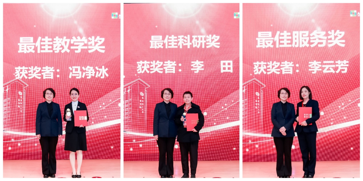 党委书记杜慧芳为华东理工大学商学院首届“最佳教学奖”获得者冯净冰、“最佳科研奖”获得者李田、“最佳服务奖”获得者李云芳颁奖。