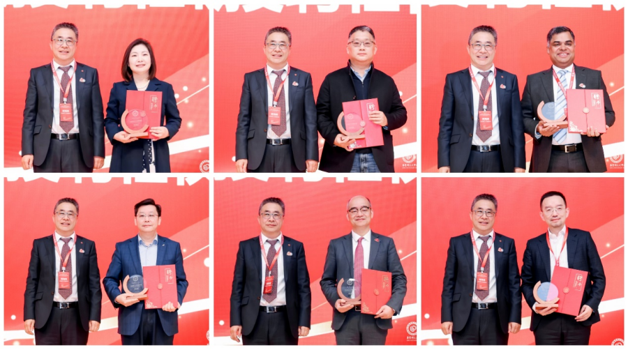 阎海峰为SGS通标标准技术服务有限公司总裁郝金玉,上汽大众汽车有限公司董事、总经理贾健旭,江森自控亚太区总裁朗智文,上海现代服务业联合会常务副会长孙建平,霍尼韦尔中国投资有限公司董事长、霍尼韦尔中国区总裁余锋、美年大健康产业集团股份有限公司董事长俞熔等6位企业嘉宾颁发客座教授聘书。