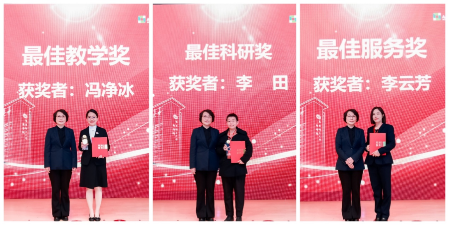 党委书记杜慧芳为华东理工大学商学院首届“最佳教学奖”获得者冯净冰、“最佳科研奖”获得者李田、“最佳服务奖”获得者李云芳颁奖。