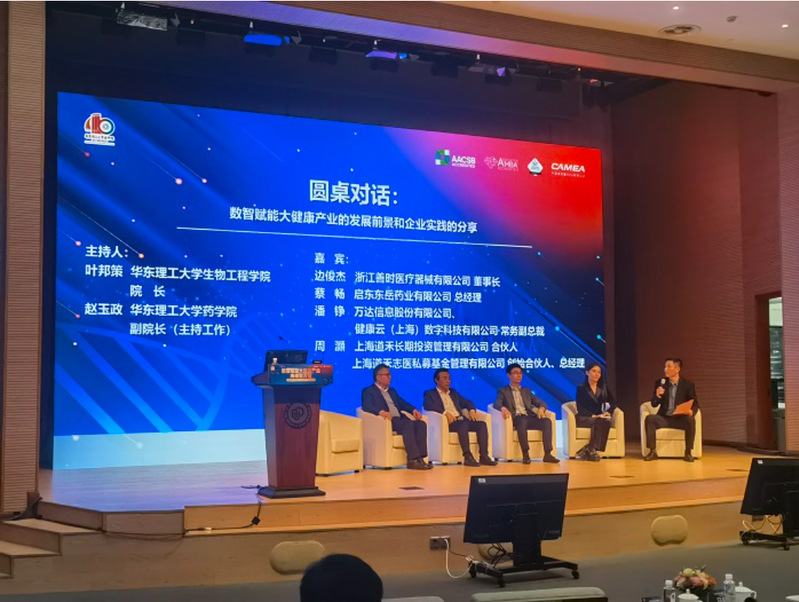 圆桌论坛环节由华东理工大学生物工程学院院长叶邦策和药学院副院长(主持工作)赵玉政联合主持。浙江善时医疗器械有限公司董事长边俊杰、启东东岳药业有限公司总经理蔡畅、万达信息股份有限公司、健康云(上海)数字科技有限公司常务副总裁潘铮、上海道禾长期投资管理有限公司合伙人周灏共同围绕“数智赋能大健康产业”主题,就大健康产业的未来发展趋势、数字化转型和智能化升级等方面进行了探讨,并就校企双方产业人才的培养、产教融合的路径和方法等内容进行了深入交流。