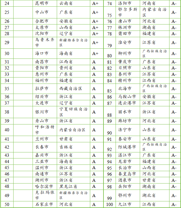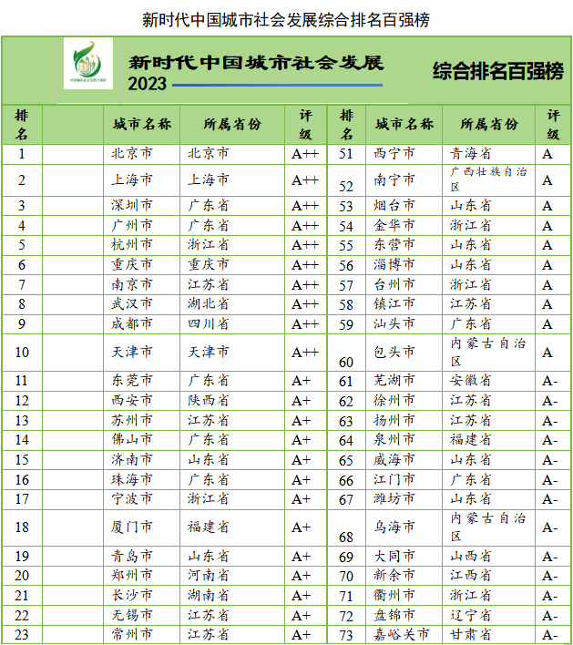 课题组根据“中国城市社会发展指标体系”,利用可获得的2021年各类统计年鉴和统计公报数据,对全国297个地级以上城市进行了排名,前100强城市分为:A++级(1-10名)、A+级(11-30名)、A级(31-60名)、A-级(61-100名)四个等级,其余城市归属B级、C级,未能进入百强榜单。