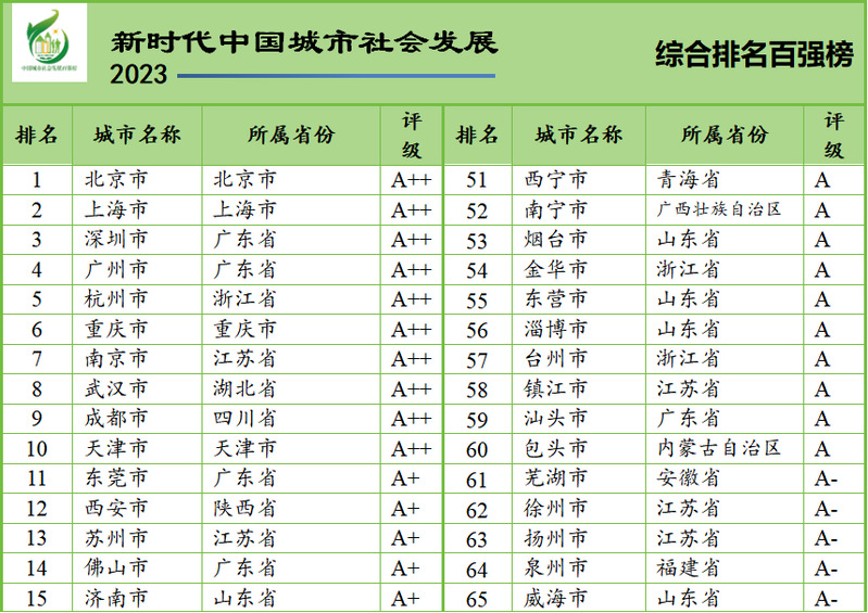 “中国城市社会发展百强榜(2023)”完整榜单: