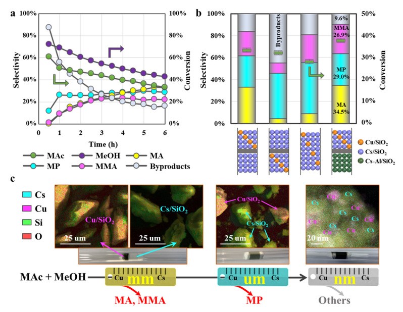 研究人员设计构建了一种含铜和铯的双催化活性位体系,能够将甲醇和乙酸甲酯/乙醇高效转化为具有高附加值的酯类和醛类化合物。研究结果(见图2)表明,当铜和铯以毫米级尺度采用双床层结构(即Cu/SiO2||Cs/SiO2)进行装填时,有效促进了甲醇的脱氢反应,并与乙酸甲酯进行羟醛缩合(包括质子转移、羟醛形成、羟醛缩合等步骤),从而获得不饱和酯和醛,其选择性分别达到76.3%和31.1%;当铜和铯以微米级尺度混合(Cu/SiO2-Cs/SiO2)时,能够显著促进催化剂界面上反应中间体的传质和加氢作用,从而得到选择性为67.6%和93.1%的饱和酯和醛;当铜和铯以纳米级尺度混合(Cu-Cs/SiO2)时,主要产物转变为甲酸甲酯、环氧丙烷等副产品。通过进一步调整活性组分的空间距离和床层分布(Cu/SiO2-Cs/SiO2||Cs/SiO2),成功实现了甲基丙烯酸甲酯(MMA)的高效四重串联催化合成。与传统的多反应器串联操作相比,这一变革性工艺路线大幅提升了原子利用率,预计能够降低生产成本超过15%,为甲醇下游产业链的发展开辟了新途径。
