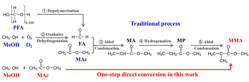 甲基丙烯酸甲酯(MMA)作为高端材料的基础原料,在光学镜片、电子信息、航空航天、光导纤维等领域具有广泛应用。截至2022年,我国MMA总生产能力已达到211.5万吨,同比增长38.24%,成为全球MMA产能最大的国家。值得指出的是,目前我国MMA的工业生产普遍存在污染大、流程复杂、核心技术受国外公司垄断等问题。在“双碳”战略目标下,开发绿色低碳环保、经济效益显著的MMA生产新工艺及其相关催化技术,将有助于推动我国MMA产业向高端发展。另一方面,甲醇是最基本的有机化工原料之一,具备碳资源和能源载体的双重属性。在CO2的大规模利用和绿氢的广泛应用中,甲醇扮演着独特的角色,成为低碳化工的化学品龙头。发展以甲醇为原料制造高端化学品的工艺路线符合我国的战略需求。