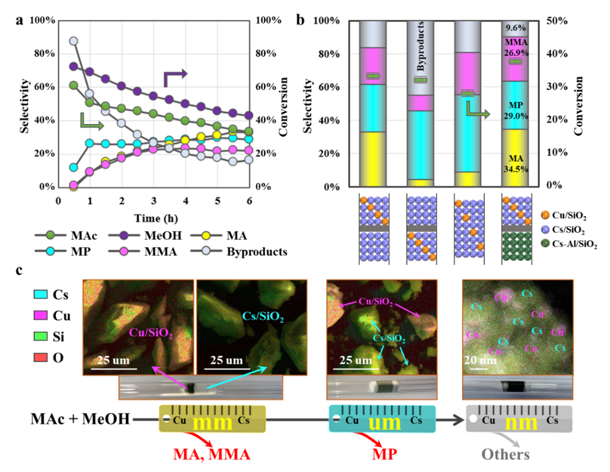 通过设计构建一种含铜和铯的双催化活性位体系,研究团队提出了一种新的甲醇与醋酸甲酯“脱氢-羟醛缩合-加氢-羟醛缩合”接力催化一步法制造MMA的工艺路线。结果表明,当铜和铯以毫米级尺度采用双床层结构(即Cu/SiO2||Cs/SiO2)进行装填时,可有效促进甲醇的脱氢反应,并与乙酸甲酯进行羟醛缩合,从而获得不饱和酯和醛,其选择性分别达到76.3%和31.1%;以微米级尺度混合(Cu/SiO2-Cs/SiO2)时,能够显著促进催化剂界面上反应中间体的传质和加氢作用,得到选择性为67.6%和93.1%的饱和酯和醛;以纳米级尺度混合(Cu-Cs/SiO2)时,主要产物转变为甲酸甲酯、环氧丙烷等副产品。通过进一步调整活性组分的空间距离和床层分布(Cu/SiO2-Cs/SiO2||Cs/SiO2),研究团队成功实现了MMA的高效四重串联催化合成。与传统的多反应器串联操作相比,该工艺路线大幅提升了原子利用率,预计能够降低超过15%的生产成本,为甲醇下游产业链的发展开辟了新途径。
