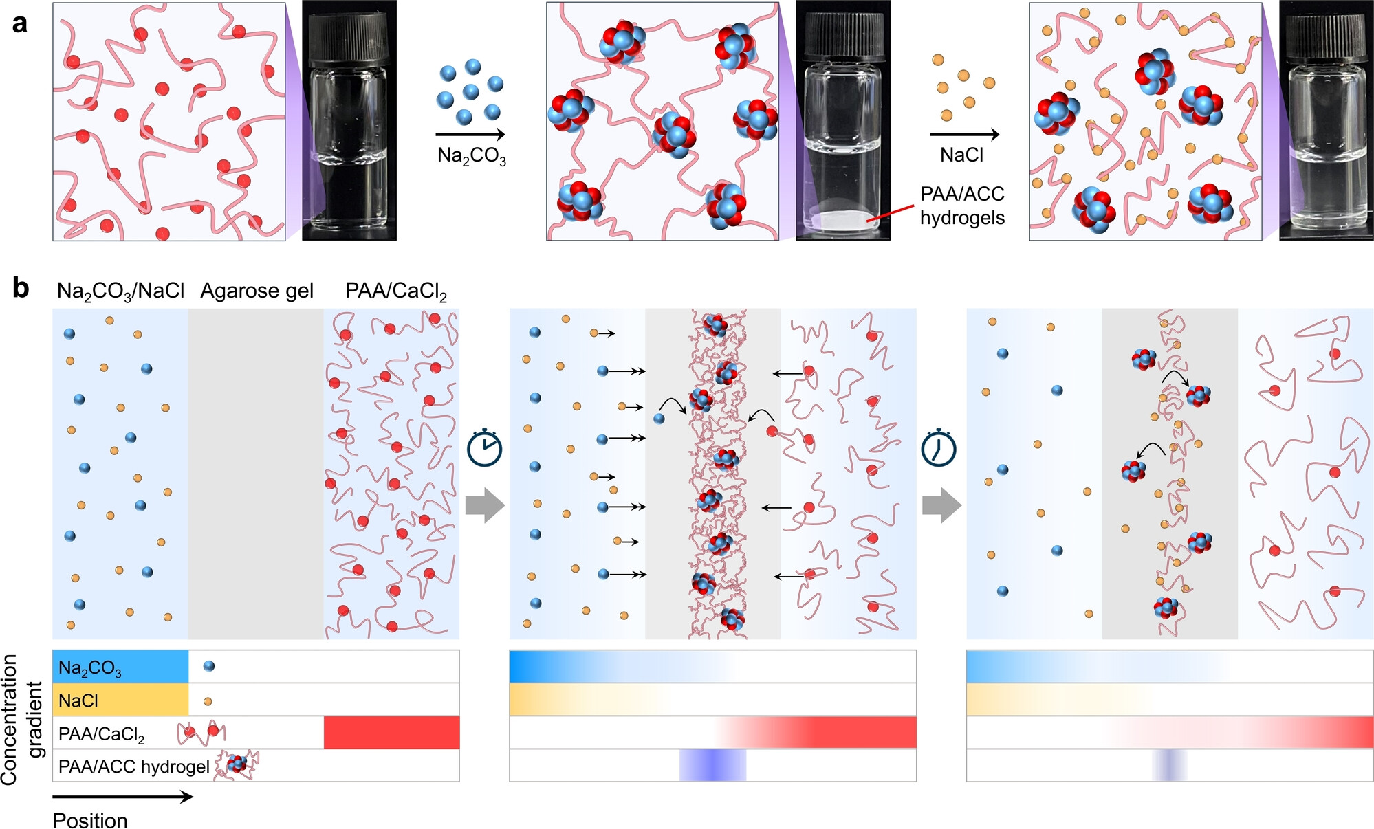 基于一类聚丙烯酸/无定型碳酸钙(PAA/ACC)超分子凝胶系统,研究团队设计了反应扩散介导的组装-解组装过程,实现了结构化超分子水凝胶的动态生长。在该体系中,通过简单控制组装前体的扩散和抑制剂的浓度,即可调控超分子水凝胶的宏观结构和寿命。