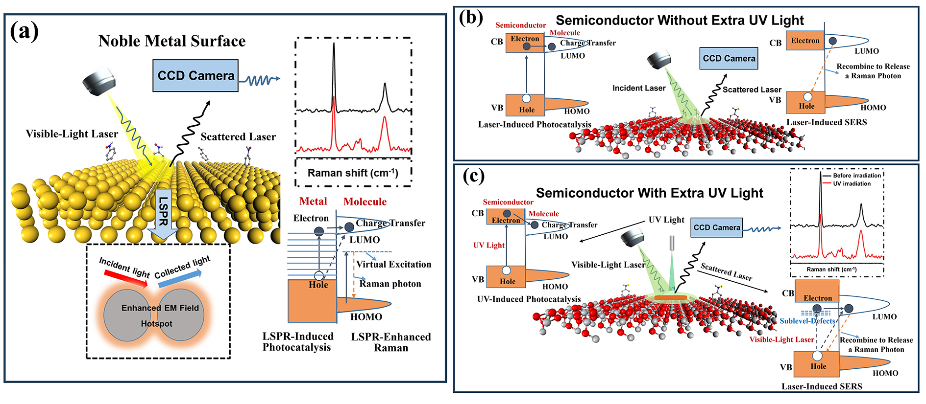 利用表面增强拉曼光谱探究在贵金属或半导体材料表面发生的光催化反应的示意图 图片均来源于《化学学会评论》