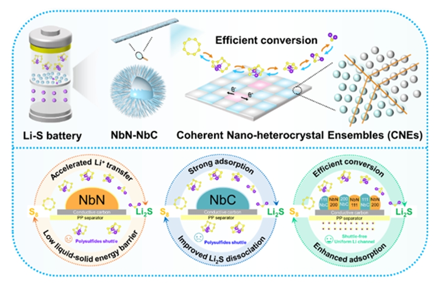 近日,华东理工大学化工学院张亚运副教授和龙东辉教授团队在高能量密度锂硫电池催化剂的设计方面取得新进展,该工作以“增强电子离域的共格纳米异质晶群优化多硫化物转化助力高能量密度锂硫电池”为题发表在《先进材料》上。