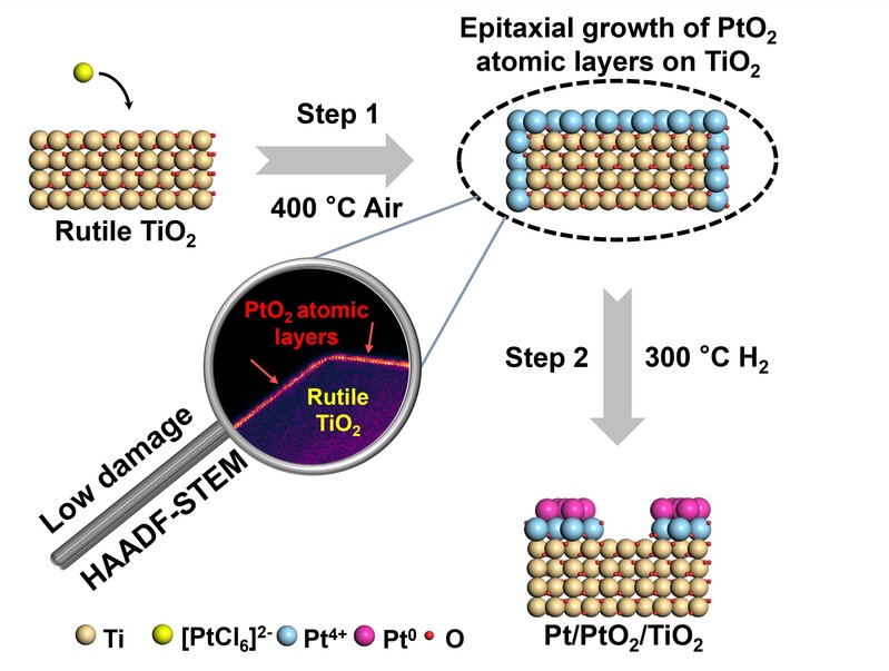近日,华东理工大学化学与分子工程学院、费林加诺贝尔奖科学家联合研究中心戴升教授、工业催化研究所郭耘教授与北京大学化学与分子工程学院马丁教授合作,在Pt/TiO2催化剂的研究中取得新进展:首次发现在金红石型TiO2上外延生长PtO2原子层,并证实了该类外延结构对多种催化反应的性能有促进作用。相关成果发表于《美国化学会志》。