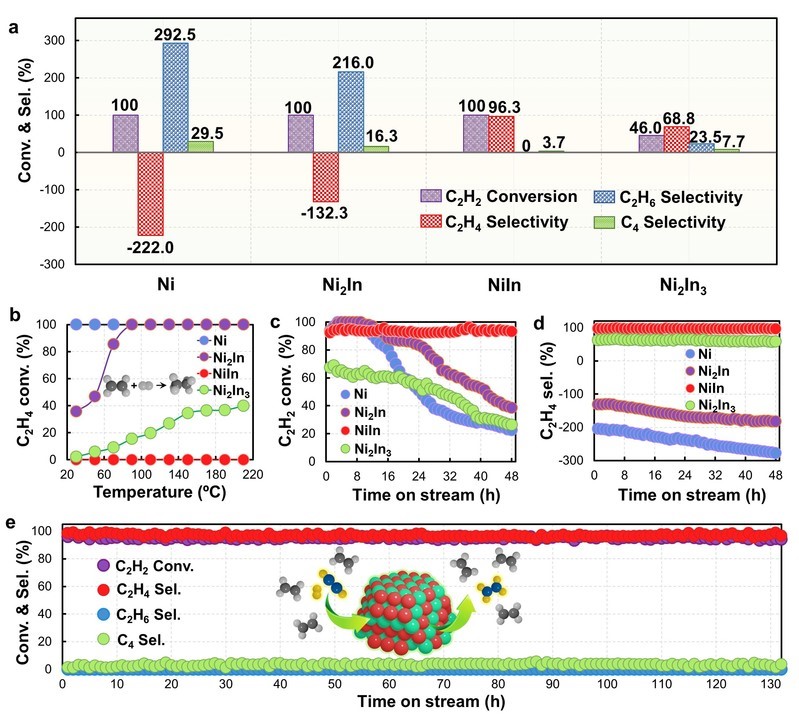 研究团队进一步通过实验合成NiIn金属间化合物催化剂及参比Ni基催化剂,并借助球差电镜和X射线吸收光谱等表征技术解析了催化剂结构,证明了长程有序、结构稳定的NiIn金属间化合物催化剂的成功制备。催化反应性能评价表明:NiIn金属间化合物催化剂在乙炔和丙炔转化率为100%时,乙烯和丙烯选择性高达97.0%,明显高于参比催化剂,证实了理论计算的预测结果。结合吸附构型分析、电子结构分析、原位红外光谱表征等机理研究手段,研究团队发现NiIn催化剂优异性能主要归因于Ni 3d与In 5s-p轨道的能量匹配和适宜的杂化,尤其是Ni 3d与In 5p轨道的杂化。