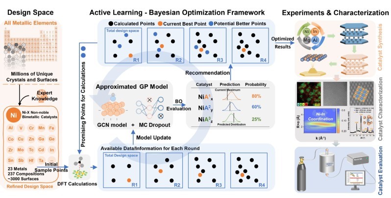 石脑油裂解碳二和碳三馏分中少量的炔烃选择性加氢是制备聚合级乙烯和丙烯的关键。非贵金属Ni因其具有未填充的d轨道电子而表现出优异的氢活化能力,然而该类催化剂选择性往往较低。研究团队先前的研究结果表明,设计和制备原子级分布的金属活性位点、通过引入第二金属精确调控其上关键物种的吸附构型能实现对目标产物选择性的调控。为寻找最优的第二金属,传统研究模式主要依赖实验试错方法,效率较低。快速发展的机器学习等数据科学技术为催化剂设计带来新的契机。基于机器学习、理论计算和实验研究的有机结合,有望实现催化剂的高效筛选,突破传统试错法的弊端。