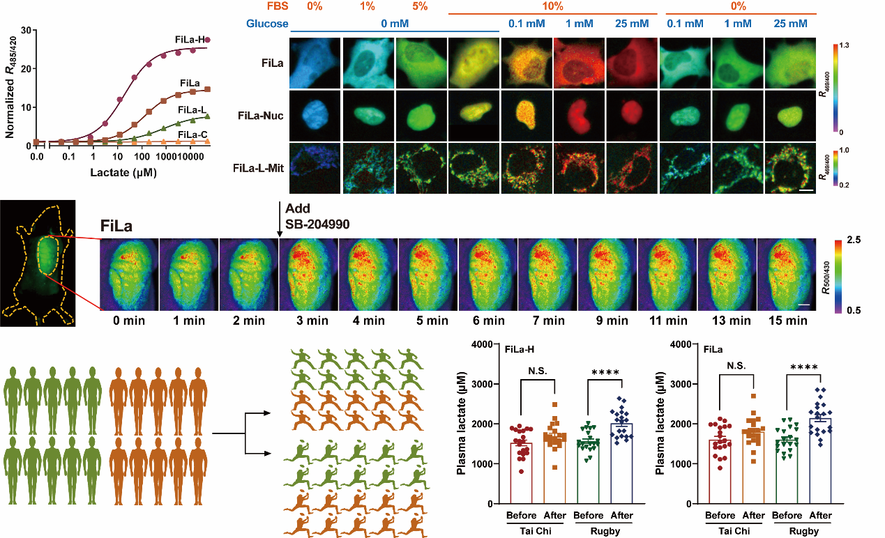 近年来越来越多的研究表明,乳酸在多种生理和病理过程中发挥了关键作用,不仅是重要的能量燃料和生物分子的合成砌块,而且能够通过直接调控蛋白相互作用和乳酸化修饰,影响细胞信号转导、基因表达调控、肿瘤和免疫代谢等过程。然而,由于缺乏面向在体和活细胞的乳酸时空分辨监测技术,有关乳酸代谢的一些重要生物学问题仍未能解决。为此,研发团队原创了系列高性能的乳酸荧光蛋白探针FiLa,揭示了乳酸在代谢、自噬、衰老和肿瘤等生理和病理过程中的重要作用。