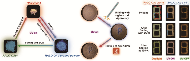 值得一提的是,利用RALO-OAc与RALO-OAc*之间的晶型互变,该团队建立了发光颜色可调的单组分、多重刺激(机械力、溶剂蒸气和热)响应平台。利用RALO-OAc晶体的多重刺激响应性能,团队进一步探索了其在高级信息加密等方面的应用潜力。该项工作有助于理解有机小分子晶体室温磷光的内在机理、开发智能的单组分有机室温磷光材料以及探索基于已知药物的高效室温磷光体系。