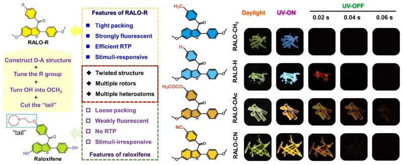 研究团队开发了一类具有多重刺激响应性的单组分纯有机室温磷光小分子,具有结构简单、原料易得、易于制备以及性能优越等特点。晶体结构中分子紧密的反平行堆积是影响其室温磷光性能的关键,当取代基为吸电子基时更有利于化合物形成紧密堆积,从而实现更高量子产率和更长的磷光寿命。进一步地,利用RALO-OAc与RALO-OAc*之间的晶型互变,团队建立了发光颜色可调的单组分、多重刺激响应平台,并利用RALO-OAc晶体的多重刺激响应性能,探索了其在高级信息加密等方面的应用潜力。