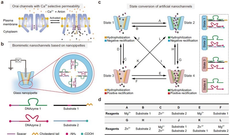 研究团队将金属离子特异性激活DNAzyme修饰在玻璃电极内壁,构建了一种内壁物化性质可调的人工仿生跨膜通道,并通过电流-电压曲线对跨膜传递进行实时动态监测。通过金属离子和DNAzyme末端基团调节人工纳米通道内壁表面的润湿性和电荷,结合超微电化学信号实时监测以及荧光显微成像,实现了人工跨膜通道在不同渗透状态之间的可逆转换与实时动态监测。人工跨膜通道具有四种不同的渗透状态,对于具有不同亲疏水性、不同电荷的功能分子,在不同渗透状态下的跨膜传递效率具有明显区别。将人工跨膜通道嵌入单个活细胞膜,通过改变通道的渗透状态,可以实现不同染料分子的选择性跨膜递送,并通过电化学信号和荧光成像进行实时动态分析。此外,人工跨膜通道还可以实现单个活细胞水平的基因沉默和钙离子选择性跨膜转运,相关跨膜传递动态过程可通过超微电化学/荧光成像进行实时监测。