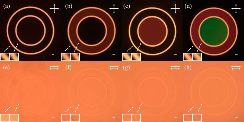 利用应力控制缺陷线,生成连续的扭曲结构,其液晶层参数满足摩根条件时,表现出旋光性,应用于宽波段矢量光生成器。矢量旋光覆盖从可见光到近红外的宽波段,使出射光具有任意设计的柱对称连续变化电矢量分布。