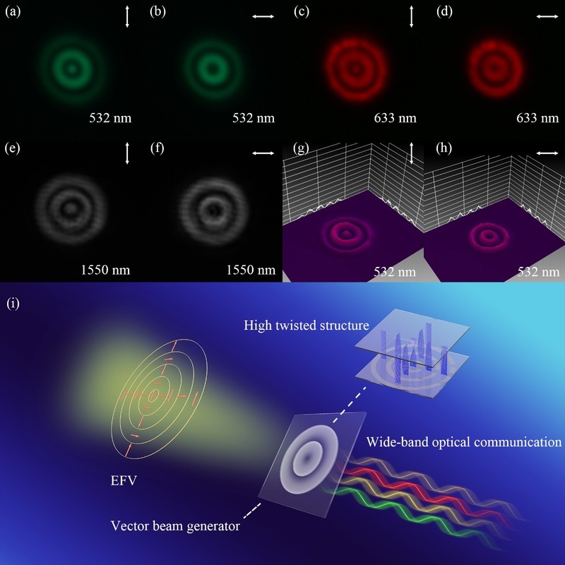 基于该矢量光发生器在宽波段工作旋光的特性,有望应用于宽波段复用的特征通信,形成任意连续分布的偏振特征而不损失强度。信号源的识别可以在信号接收端检测实现,而不会额外占用通信带宽。该器件还可以将入射光分割出多个极化状态进行分离传输。这种旋光后的分离传输形式具有实现加密通信的潜力,并有望实现宽波段多路复用。