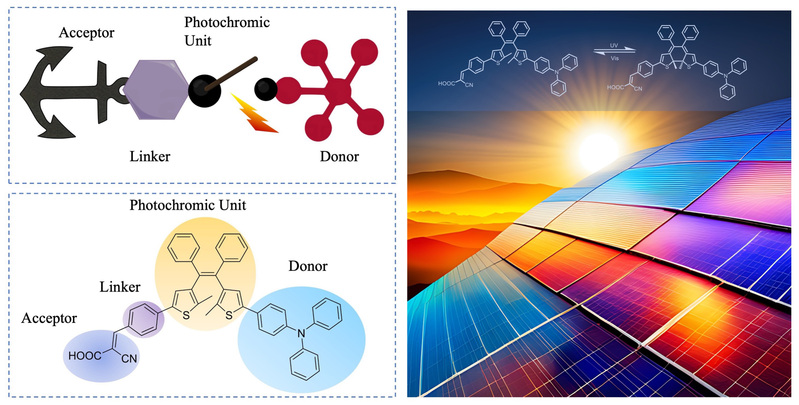 光致变色有机敏化剂功能基团示意图(左上)、分子结构及功能基团划分(左下)及光致变色分子光开关结构转换方程及相应的彩色太阳能电池示意图(右)