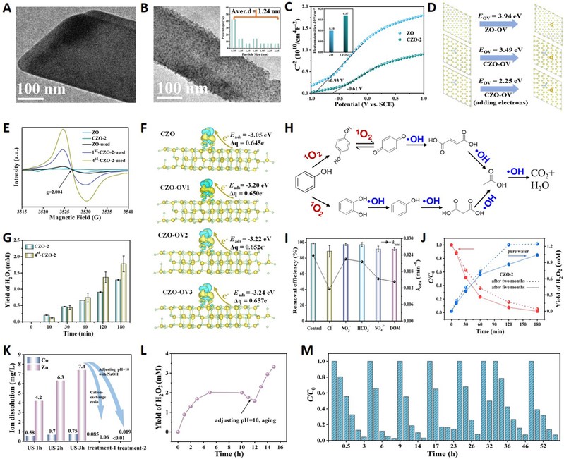 研究团队采用一步水热结合光沉积的方法制备了Co纳米簇负载ZnO棒状压电催化剂(CZO)。实验结果表明,在不加入任何有机牺牲剂的条件下,超声3小时最高可生成1.8 mM H2O2以及对苯酚50.9%的矿化率,分别是空白ZnO的10.5倍和13倍。进一步研究表明,CZO压电体系具有优异的抵抗pH值、阴离子、天然有机质等环境基质干扰的能力,即使在环境中暴露5个月之久,CZO依然保持优异的原位产H2O2及降解苯酚的性能。而溶出的钴和锌离子只需经过简单的加碱陈化处理,即可实现金属离子回收及产H2O2能力的再生。环境友好型可再生CZO压电体系可实现对有机污染物52小时以上的长效降解,在水污染控制领域具有潜在的应用前景。