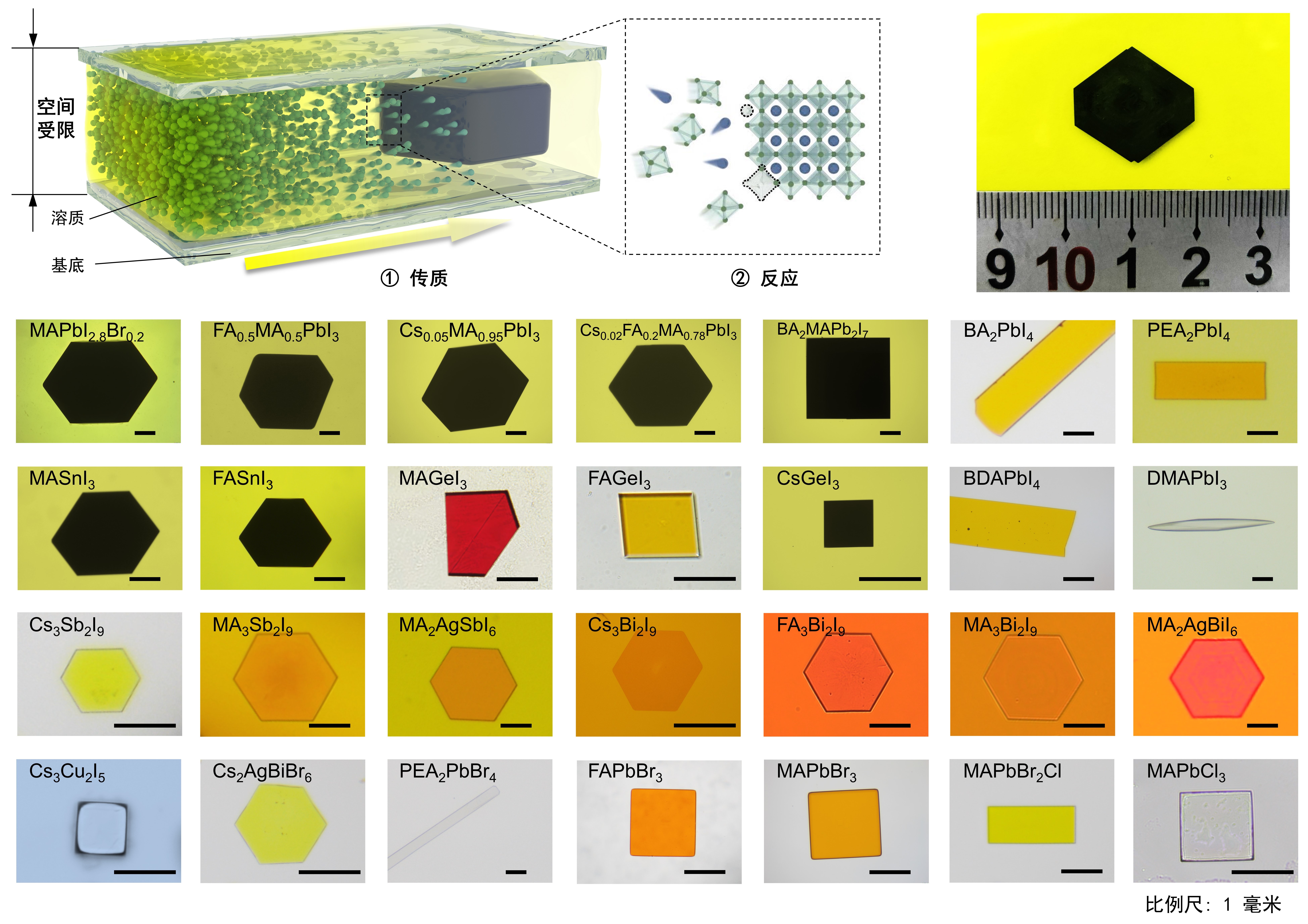 然而,国际上尚无钙钛矿单晶晶片的通用制备方法。钙钛矿单晶薄膜材料生长涉及成核、溶解、传质、反应等多个过程,其生长过程的控制步骤仍不明确。传统的空间限域方法需要较高温度的生长条件,且生长速率慢、只能制备毫米级单晶,难以满足单晶晶片的实际应用需求。