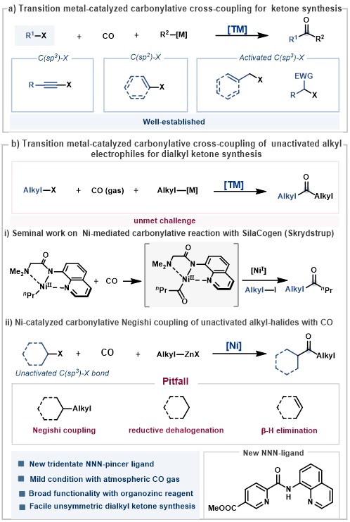 酮是天然产物、药物和材料中广泛存在的重要官能团之一,也是有机合成中最常见的合成中间体。过渡金属催化羰基化反应是构建酮官能团的一种实用策略,其中以钯催化有机亲电试剂、金属有机试剂和一氧化碳参与的三组分羰基交叉偶联发展最为成熟。然而,长期以来,这个经典领域面临的主要挑战之一是如何在温和条件下实现非活化烷基卤化物通过羰基化反应制备烷基酮,主要难点在于非活化烷基卤化物在π酸性CO气体存在下与低价过渡金属中间体的氧化加成过程缓慢。