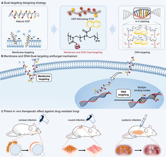 耐药真菌严重威胁人类生命健康,传统的单靶点抗真菌药物难以应对耐药真菌的迅速发展。双靶点药物有望通过作用于微生物的多个途径显著降低真菌耐药发生,在药物研究中具有很大前景。因此,设计和发现双靶点抗耐药真菌新分子对耐药真菌感染治疗和应对真菌耐药性挑战具有重要意义。临床抗真菌药物数量有限且往往伴随着严重的毒副作用,导致真菌感染对人类健康构成重大威胁,真菌耐药性的迅速出现和传播加剧了这一现状。尽管临床中通过两种药物联用的替代方案实现双靶点抗耐药真菌,但两种药物在体内的分布和药代动力学各不相同,使得治疗效果受到限制。真菌和哺乳动物细胞同作为真核细胞结构高度相似,导致抗真菌靶点有限,即使发现单一靶点的选择性抗真菌分子也极其困难。因此,双靶点药物在抗真菌研究领域一直未取得突破。刘润辉教授课题组在前期研究中,提出了以优异生物安全性的聚噁唑啉(多肽主链上酰胺键转移至侧链)模拟天然多肽,创新性地实现了基于聚噁唑啉骨架的功能性多肽模拟,发现了体内外高效抗耐药细菌和耐药真菌的聚噁唑啉活性分子(Angew. Chem. Int. Ed.2020, 59, 6412,VIP论文,ESI高被引;Angew. Chem. Int. Ed. 2022, 61, e202200778,VIP论文;J. Am. Chem. Soc.2023, 145, 25753,JACS Spotlight)。本研究中进一步提出通过正电荷和两亲性的聚噁唑啉模拟宿主防御肽,同时引入DNA结合基团作为疏水性结构的设计策略,通过调控正电荷和DNA结合基团的比例成功获得了高活性、高选择性双靶点抗耐药真菌新分子。双靶点活性分子对多种临床常见耐药真菌(包括念珠菌属、新生隐球菌、格特隐球菌和烟曲霉菌)具有高活性和高选择性,在角膜炎、擦伤、系统感染等多个小鼠感染模型中展示优异治疗耐药真菌感染效果,为抗耐药真菌药物研究和应对抗真菌耐药性挑战提供了新思路。