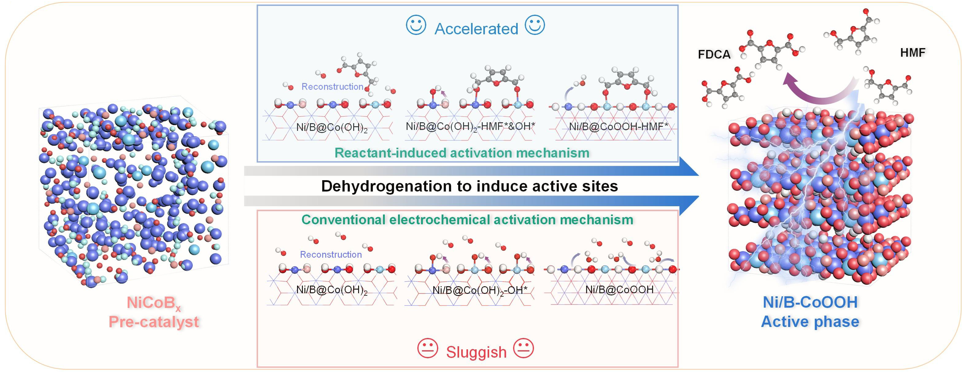 研究团队开发了一种新型非晶态类金属NiCoBx材料,用于5-羟甲基糠醛(HMF)电氧化反应(HMFOR)时,可在相对较低的电位下选择性氧化HMF的性能。在HMFOR过程中,当NiCoBx结构演化形成活性相时,含有醛基官能团的反应物HMF会优先吸附在催化剂材料表面,加速金属位点的电子转移及脱氢过程,从而促进HMFOR活性相的原位生成。