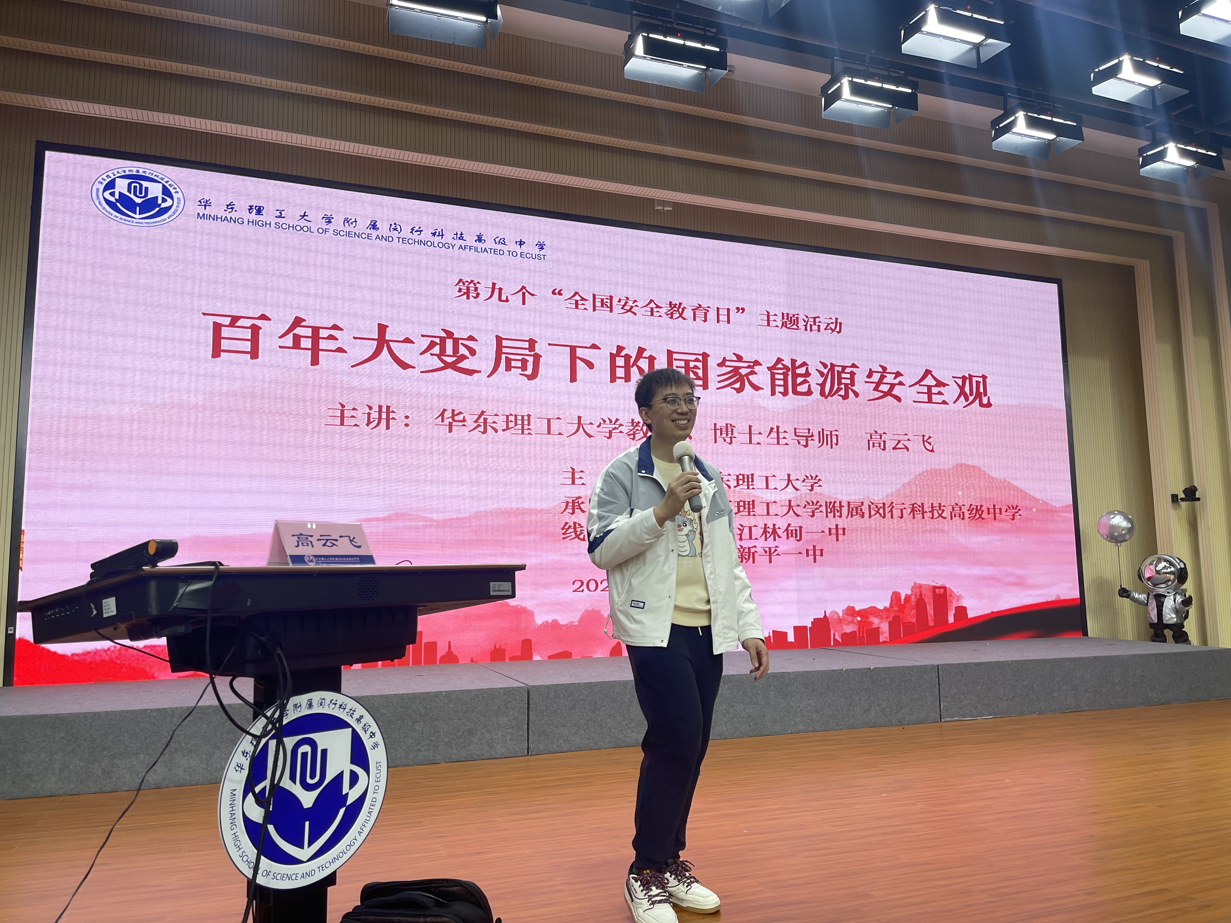 资源与环境工程学院高云飞教授走进华东理工大学附属闵行科技高中,云南省寻甸县仁德第一小学、云南省新平县第一中学、黑龙江林甸县第一中学同时进行线上观看,与对口帮扶县中完成四地联动。高云飞以“百年大变局下的国家能源安全观”为题,从日常生活出发,给同学们讲述了能源和我国的能源现状、为什么能源也会面临安全的问题,结合地图分析,明确我国能源安全面临的问题以及新能源如何缓解我们国家的能源安全挑战。