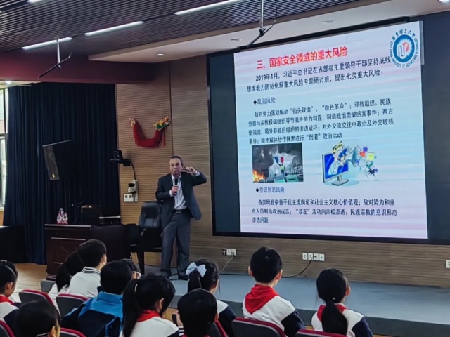 社会与公共管理学院副院长陈丰教授走进上海市黄浦区卢湾一中心小学进行线下讲座,围绕“坚持总体国家安全观,筑牢新时代安全防线”主题进行宣讲。他从国家安全观的定义出发,介绍了总体国家安全观的新形势新变化,并深入分析了变化背后国际化进程推进、企业走出去的需求等内在动因。他指出,党的二十大报告提出推进国家安全体系和能力现代化,而安全是发展的前提,发展是安全的保障,我国综合国力增强,和发达国家差距缩小,正处于社会转型过程中的中国,各种矛盾和挑战很多,重大风险面广点多,防控形势严峻,因而更应提高国家安全意识,采取积极行动,筑牢我国的安全防线。