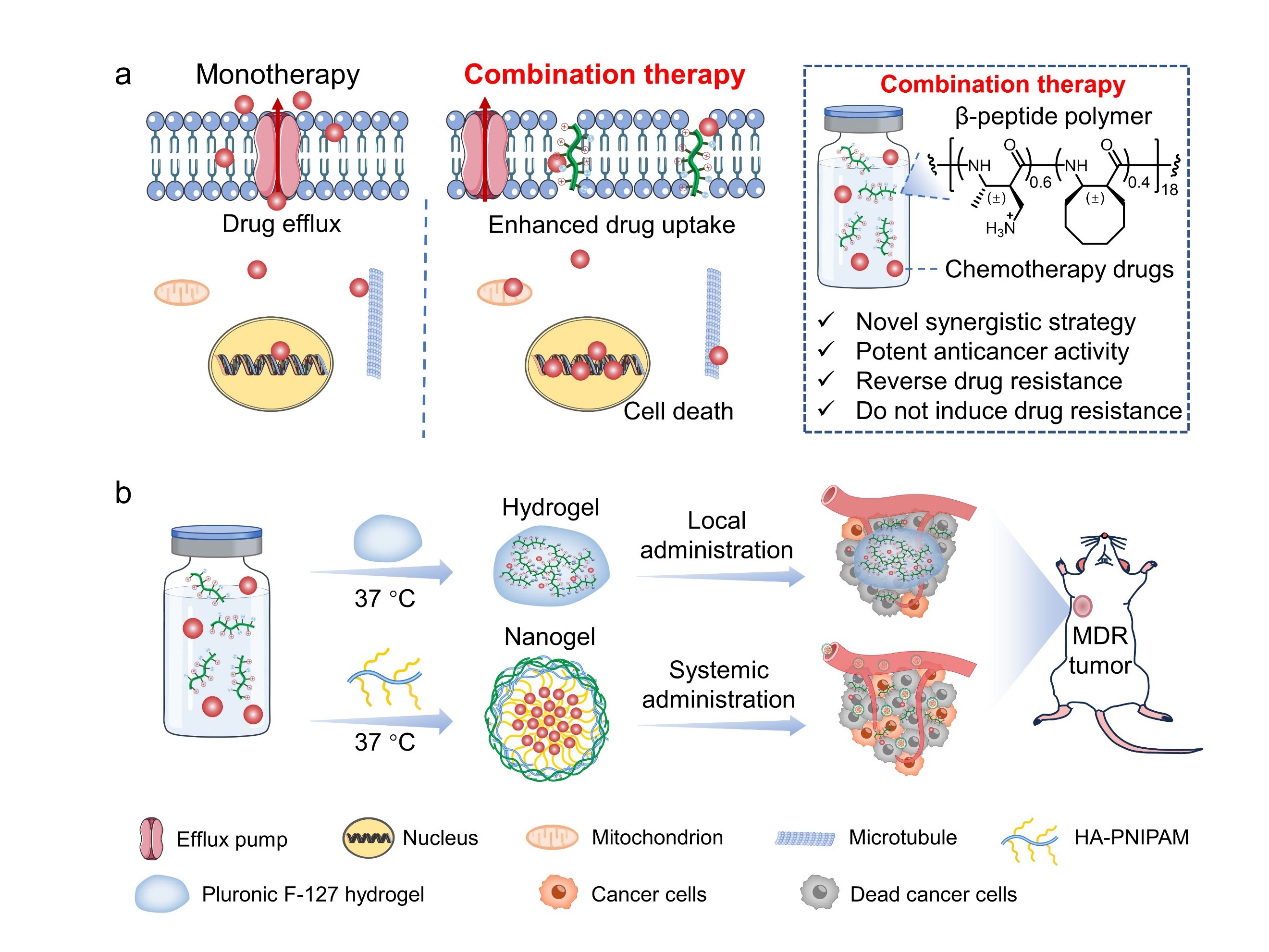 在前期研究中,研究团队开发了一类抗多药耐药肿瘤的β-多肽聚合物。此类聚合物通过膜裂解机制杀死癌细胞,并表现为对多药耐药癌细胞高效且广谱的抗癌活性。在此基础上,研究团队发现抗肿瘤β-多肽聚合物和多种化疗药物具有广谱且高效的协同作用,可逆转多药耐药癌细胞对多种化疗药物的耐药性。在小鼠多药耐药黑色素瘤和耐药原位乳腺癌模型中,β-多肽聚合物均显著改善了阿霉素的治疗效果,且癌细胞没有对β-多肽聚合物和阿霉素的协同组合产生耐药性。