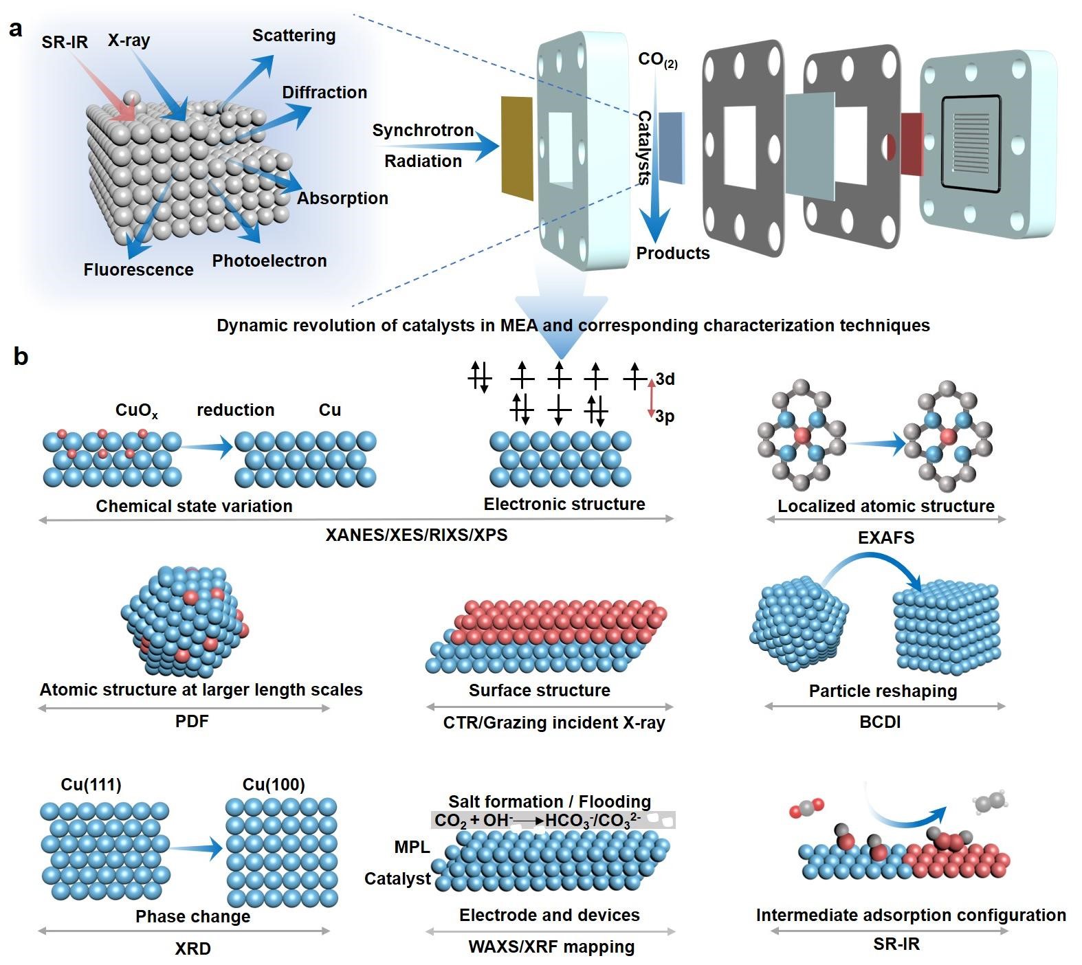 利用可再生电力将二氧化碳/一氧化碳转化为增值燃料展现出了巨大的吸引力。尽管在这方面已取得了显著的研究进展,但CO(2)电解体系在综合效率和稳定性方面仍面临重大挑战。在CO(2)RR过程中,电催化剂的化学组成、局域配位环境、晶体结构等通常会受到微环境和施加电位的影响,经历不可避免的动态结构变化;气体扩散电极(GDE)也面临由于电极击穿和盐析造成的稳定性挑战;膜电极(MEA)器件内的电子、离子传输也直接影响电极界面的微环境及相应的性能。鉴于CO(2)RR的性能和稳定性高度依赖于催化剂材料和反应器件,深入研究原位/工况条件下电催化剂材料的原子组态以及MEA器件内的动态演变规律,对深入理解CO(2)电解过程尤为重要。